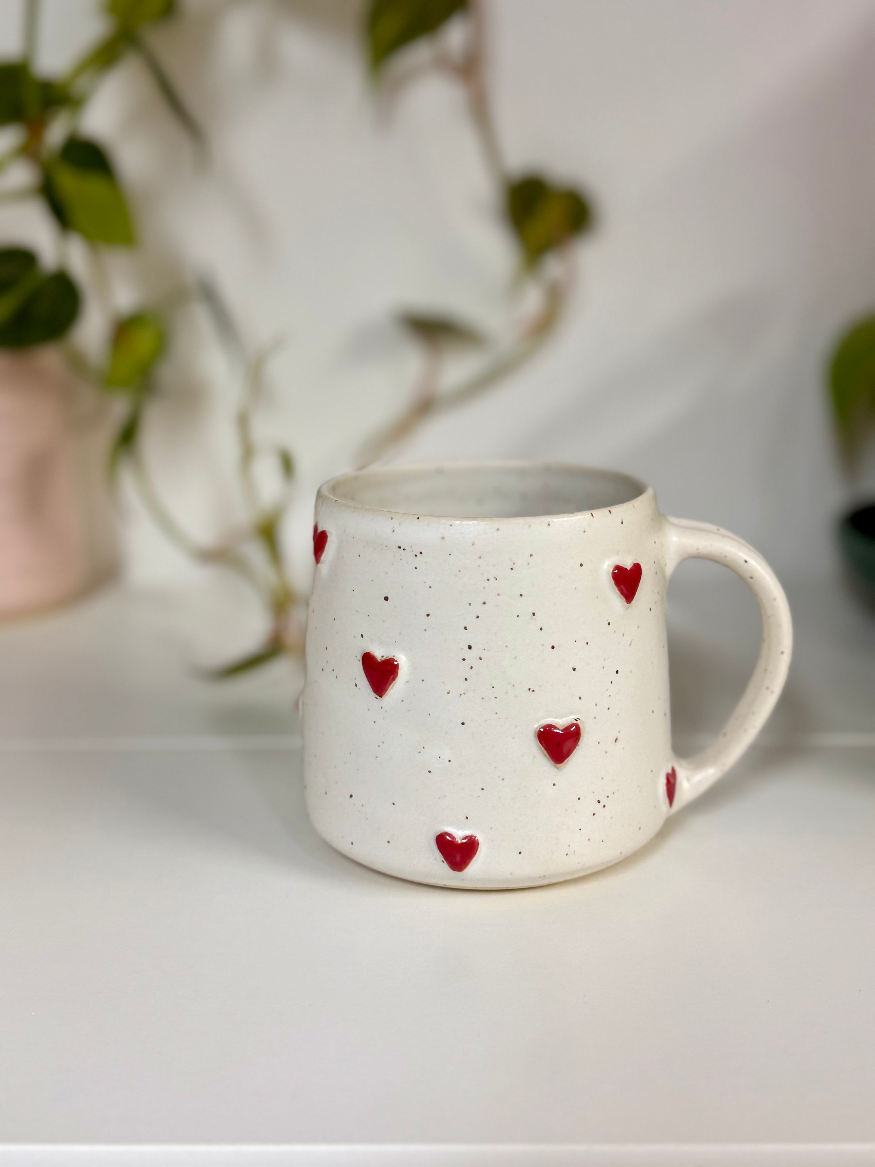 White speckled stoneware, hand thrown on a wheel, and glazed and painted by hand.
