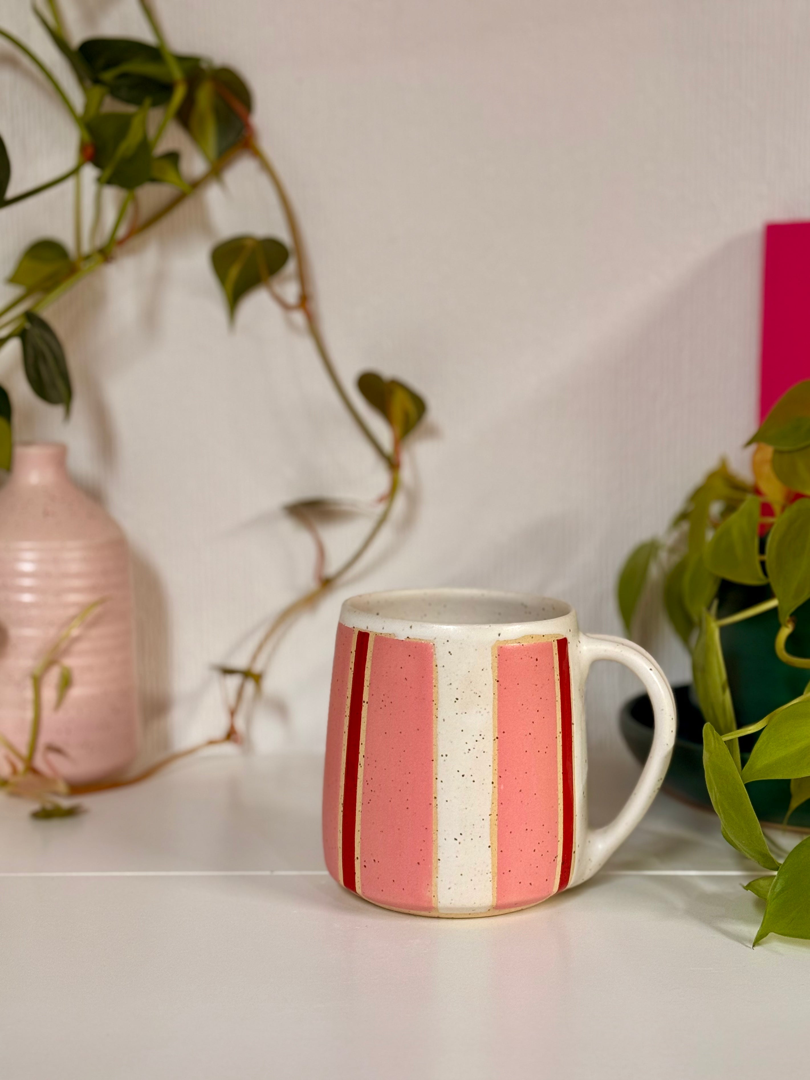 White speckled stoneware,  hand thrown on a wheel, and glazed and painted by hand.