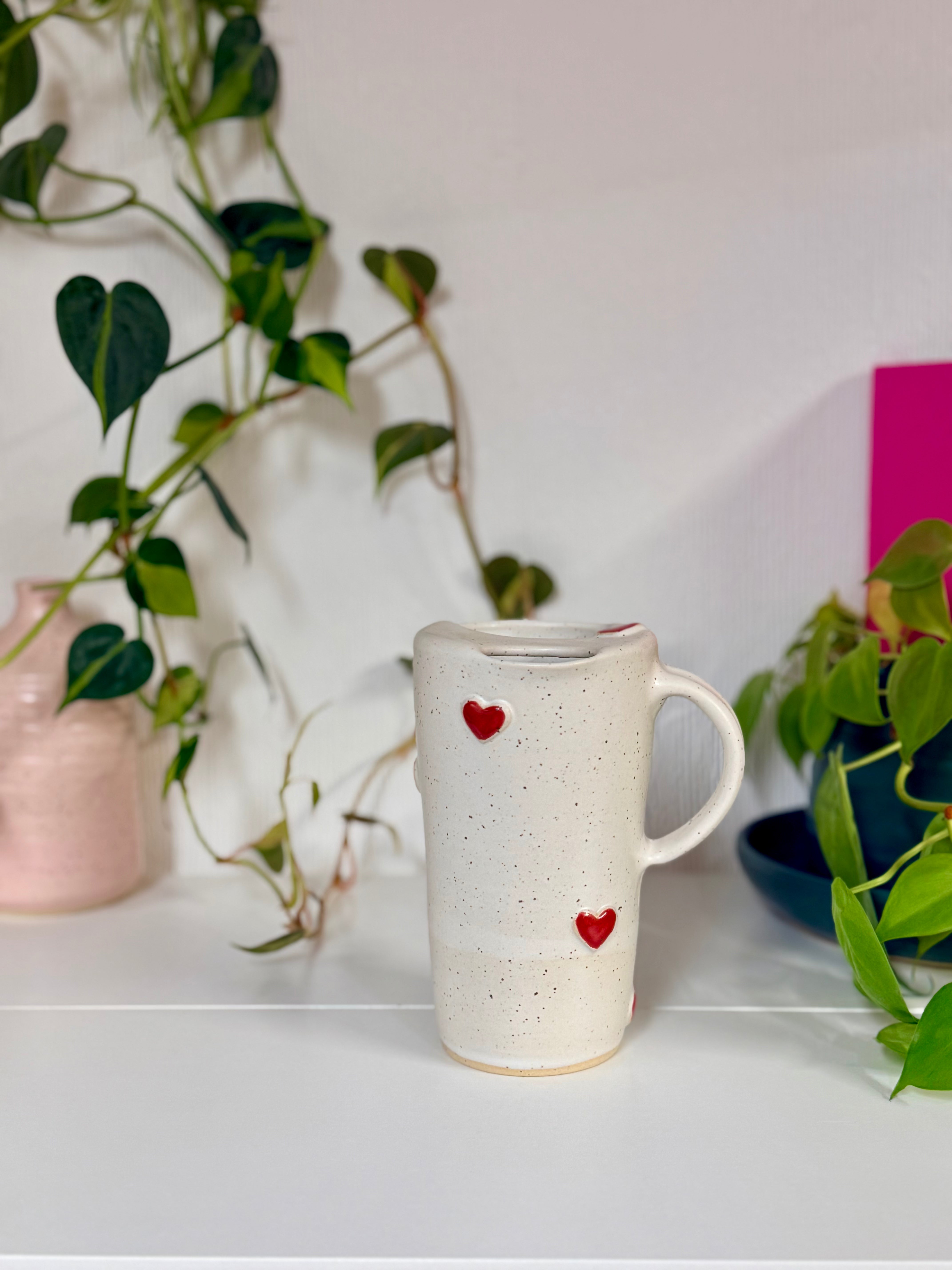 Handled travel mug with partially covered top.  Holds approx 18oz and should fit all cars. (Fits a Subaru)