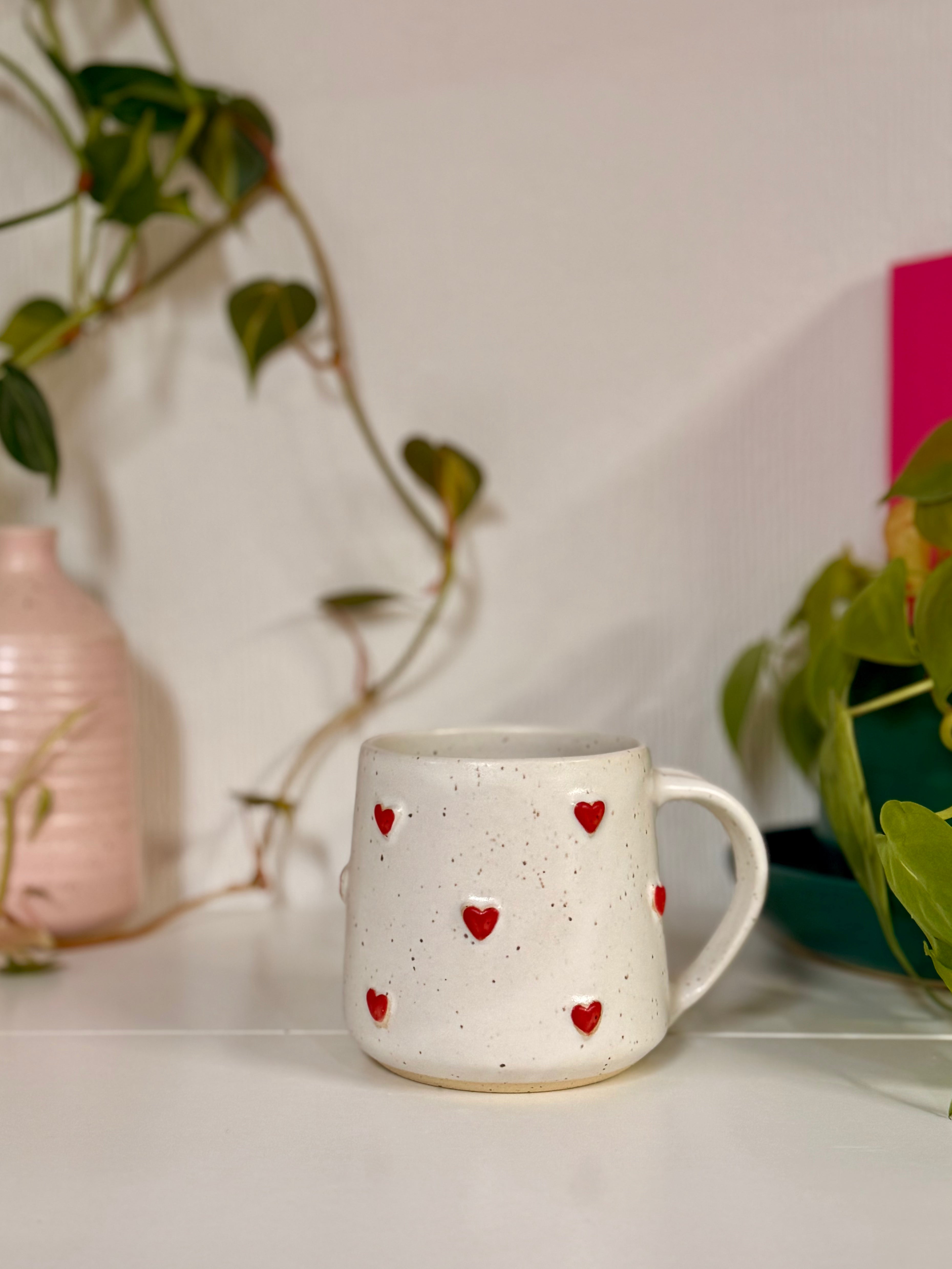 White speckled stoneware, hand thrown on a wheel, and glazed and painted by hand.